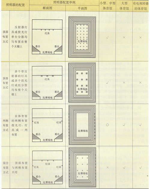 2. 燈具在場地上空和側(cè)面布置相結(jié)合。這種布置一般適用于多功能體育館,水平照度和垂直照度可以獲得適當?shù)谋嚷省?/span>