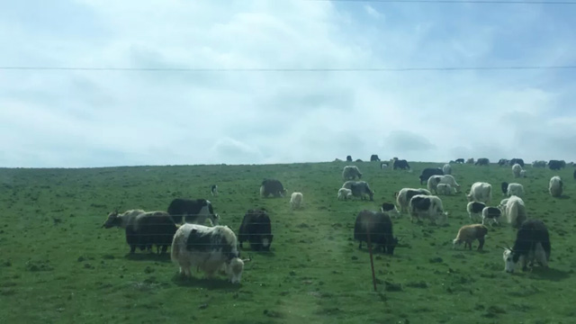 看慣了家鄉(xiāng)的山山水水,這樣毫不掩飾地坦露的自然美景、展示著大自然的本來面目,無意間給人一種震憾,一種真實(shí),一種坦蕩;草地上大群的白色山羊和黑色的牦牛低著頭吃草,在這驕陽(yáng)似火的七月,站在海拔3520米的日月山山口,凜冽的寒風(fēng)急掠而過,竟然令人瑟瑟發(fā)抖。下車,在頂峰日月山碑旁大家拍照留念,心曠神怡。