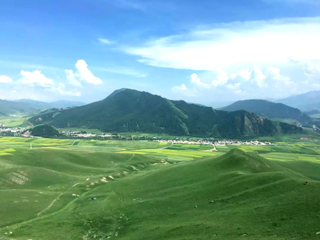 在7、8月份,高山牧場(chǎng)的野花把草原點(diǎn)綴得五彩繽紛,如綢似錦;數(shù)不盡的牛羊膘肥體壯,若隱若現(xiàn);成片的油菜花在湖邊肆意開放,藍(lán)天白云映襯下的金黃、嫩綠,打造出一片絕美的曠世風(fēng)景。