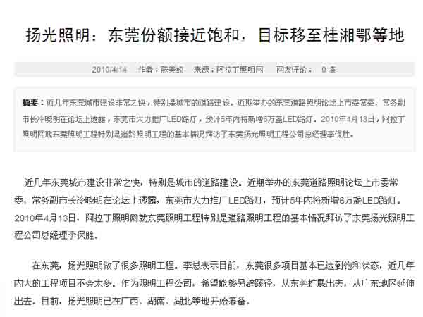 在東莞,揚光照明做了很多照明工程。李總表示目前,東莞很多項目基本已達到飽和狀態(tài),近幾年內(nèi)大的工程項目不會太多。作為照明工程公司,希望能夠另辟蹊徑,從東莞擴展出去,從廣東地區(qū)延伸出去。目前,揚光照明已在廣西、湖南、湖北等地開始籌備。